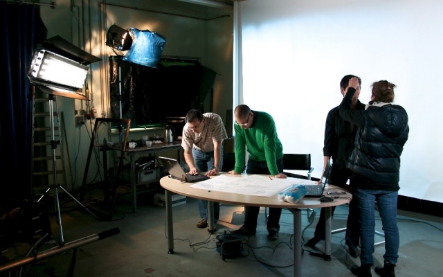 Beim Kunden wurde eine Studiosituation aufgebaut. Hier wird der Konzeptionsprozess bei der Produktentwicklung visualisiert. Die eigentlichen Arbeitsräume des Ingenieurteams ließen keine umfangreichen Licht- und Kamerabühnenaufbauten zu.